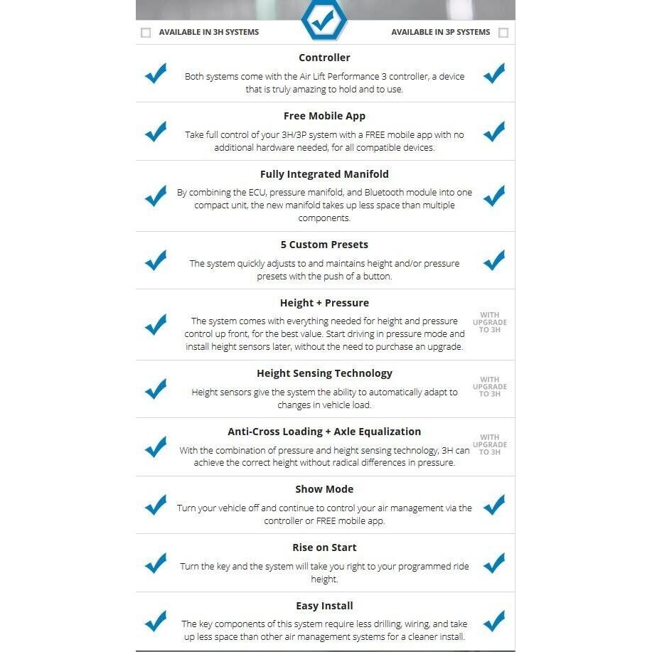 • Height + Pressure Auto Level – The system adjusts automatically to maintain your preset ride height