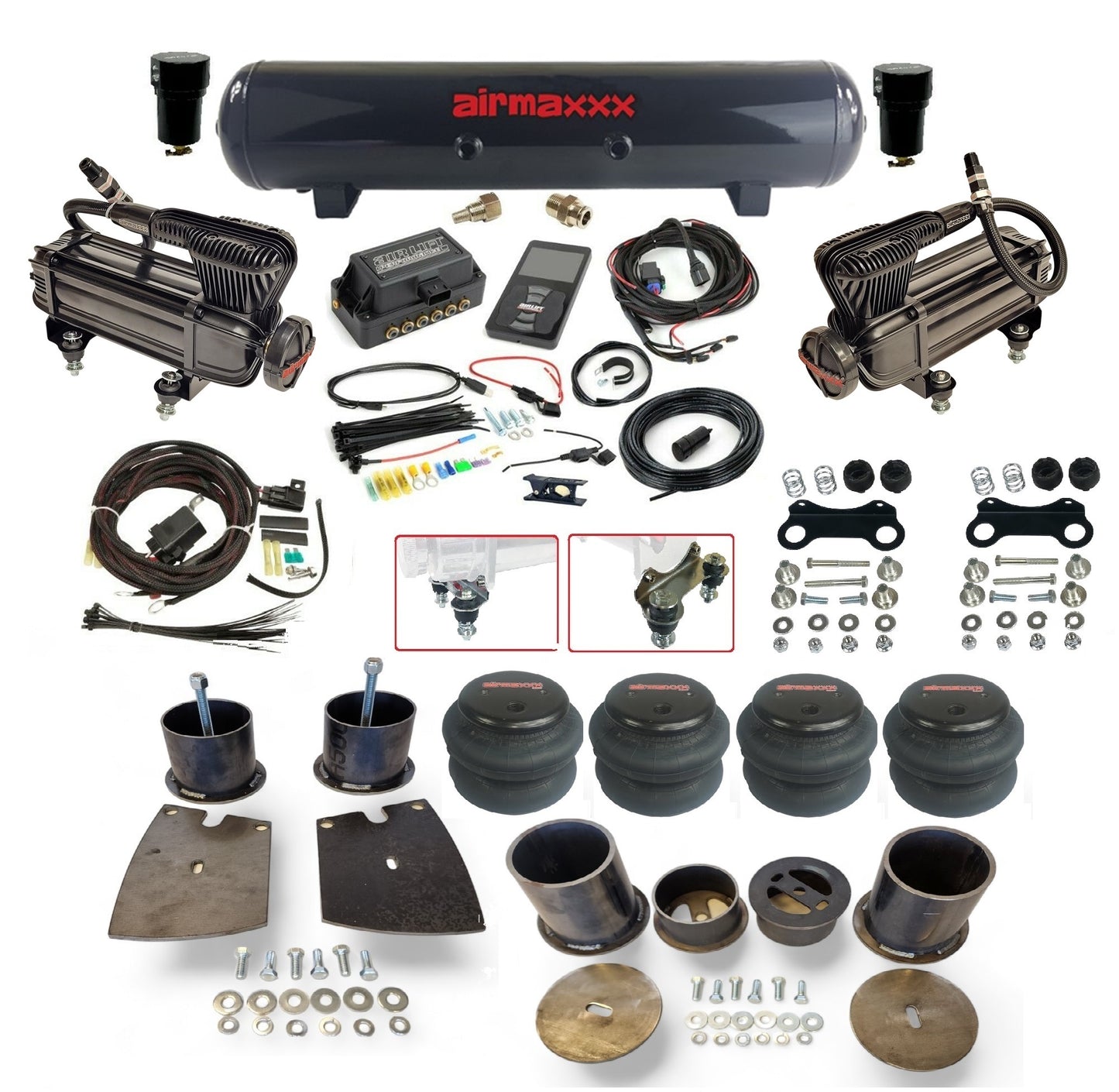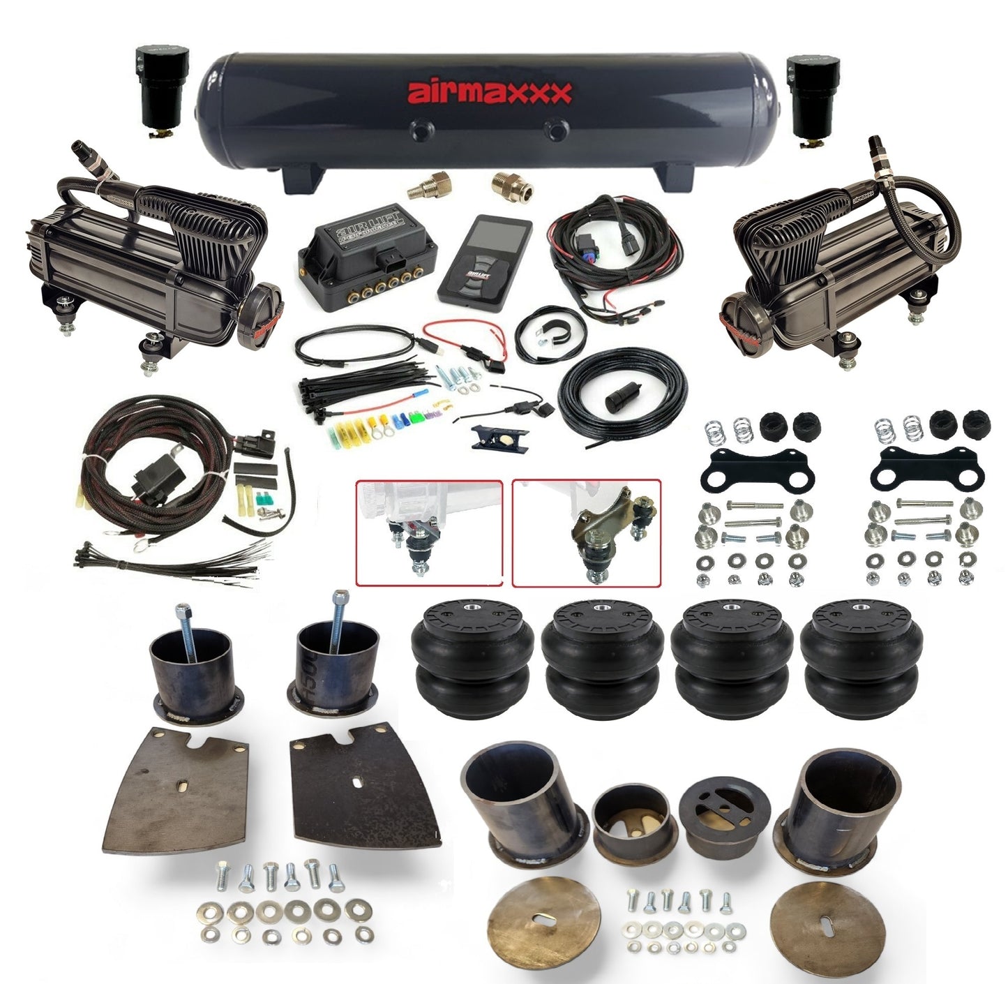 High-Performance airmaxxx Components: Dual 580 compressors, 5-gallon tank, and 2600 air bags for strong, reliable air management.