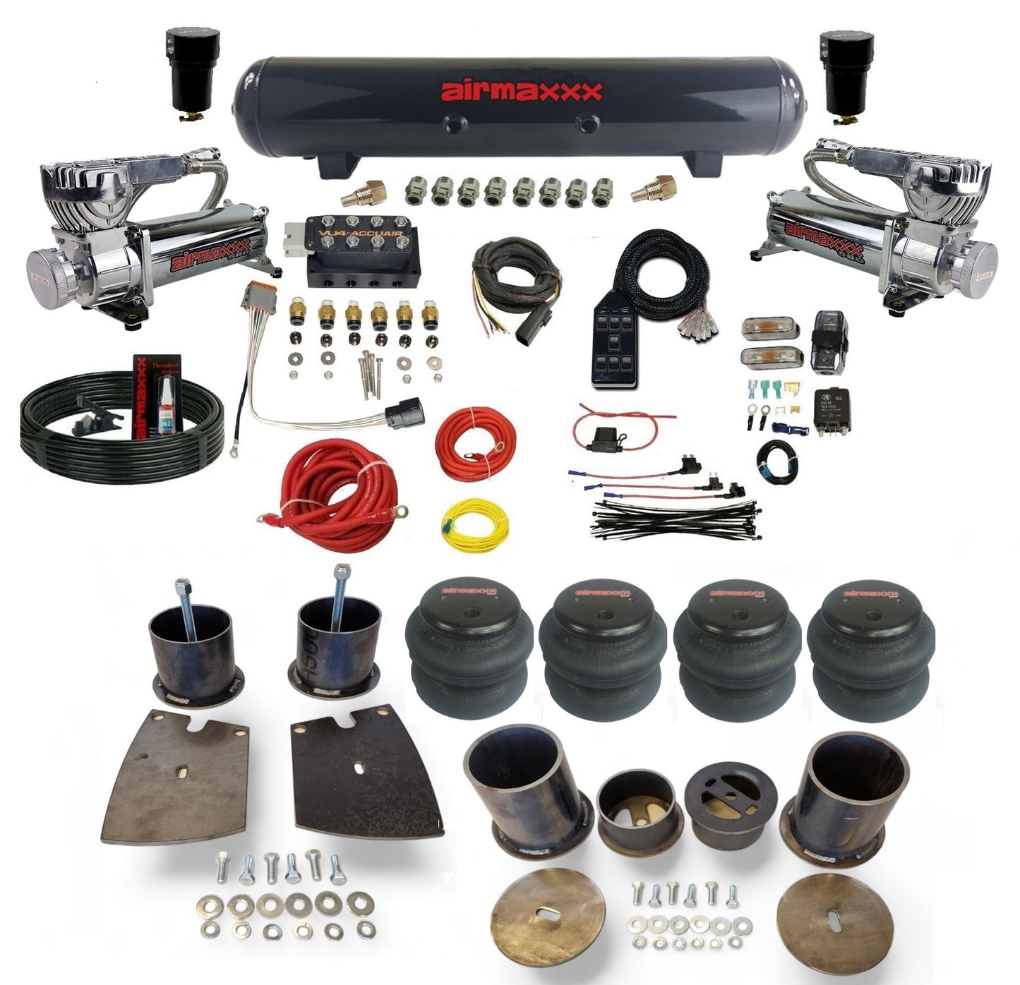 The heart of this kit is the Accuair VU4 manifold, providing full 4-corner independent control. Paired with dual chrome 580 compressors and a 5-gallon tank, you get reliable air management with fast response. The AVS 7-switch controller makes adjustments simple, while durable airmaxxx components ensure long-term performance.