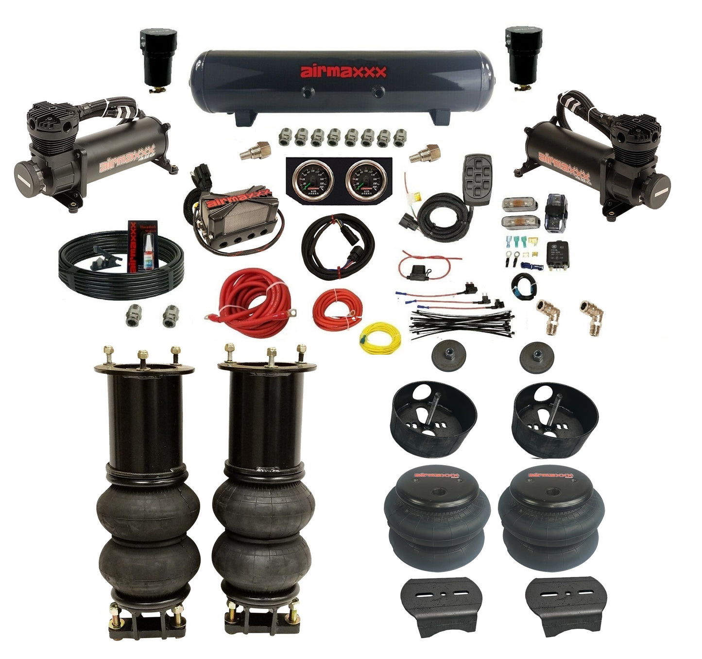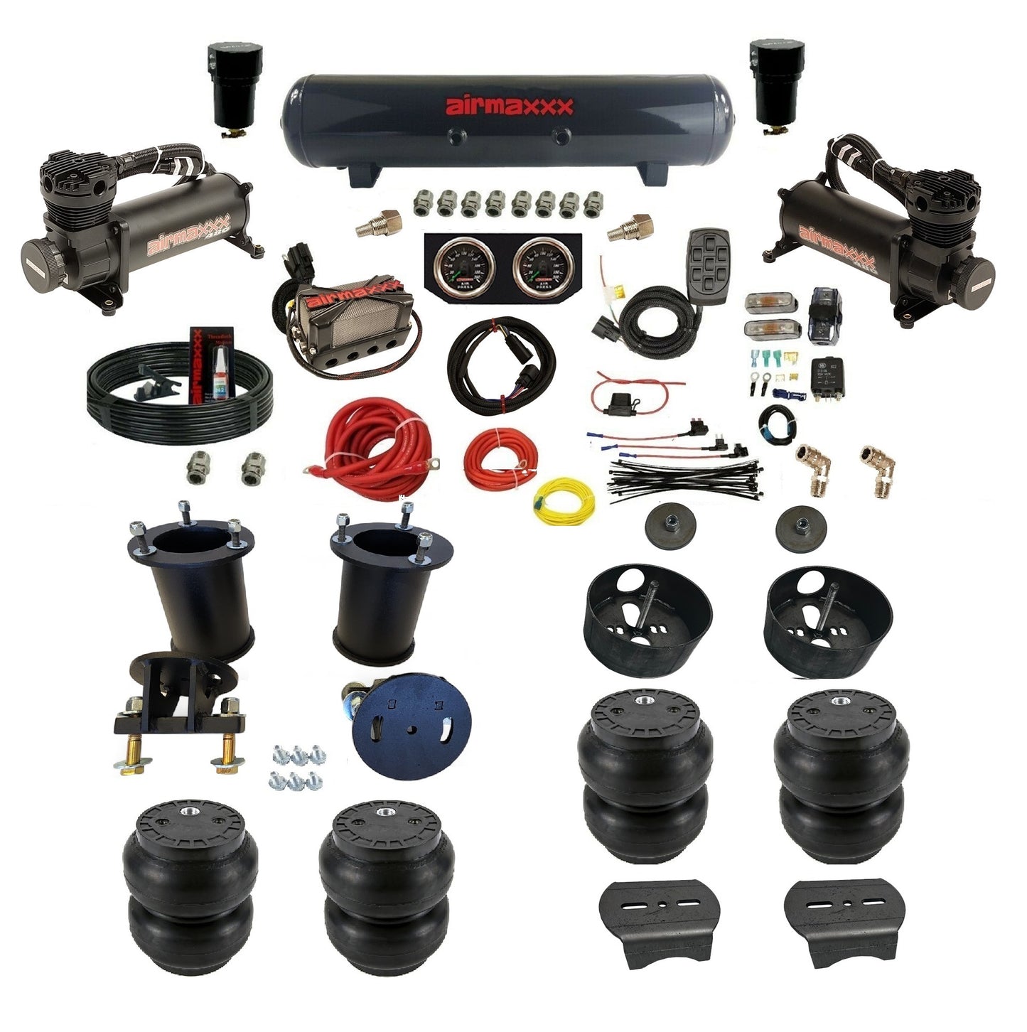 With its plug-and-play X4 3/8" valve manifold, dual 480 black compressors, and dual needle gauges, this kit delivers precise control, faster air-up times, and a cleaner install with fewer fittings. Whether you’re chasing stance, comfort, or performance, airmaxxx delivers.