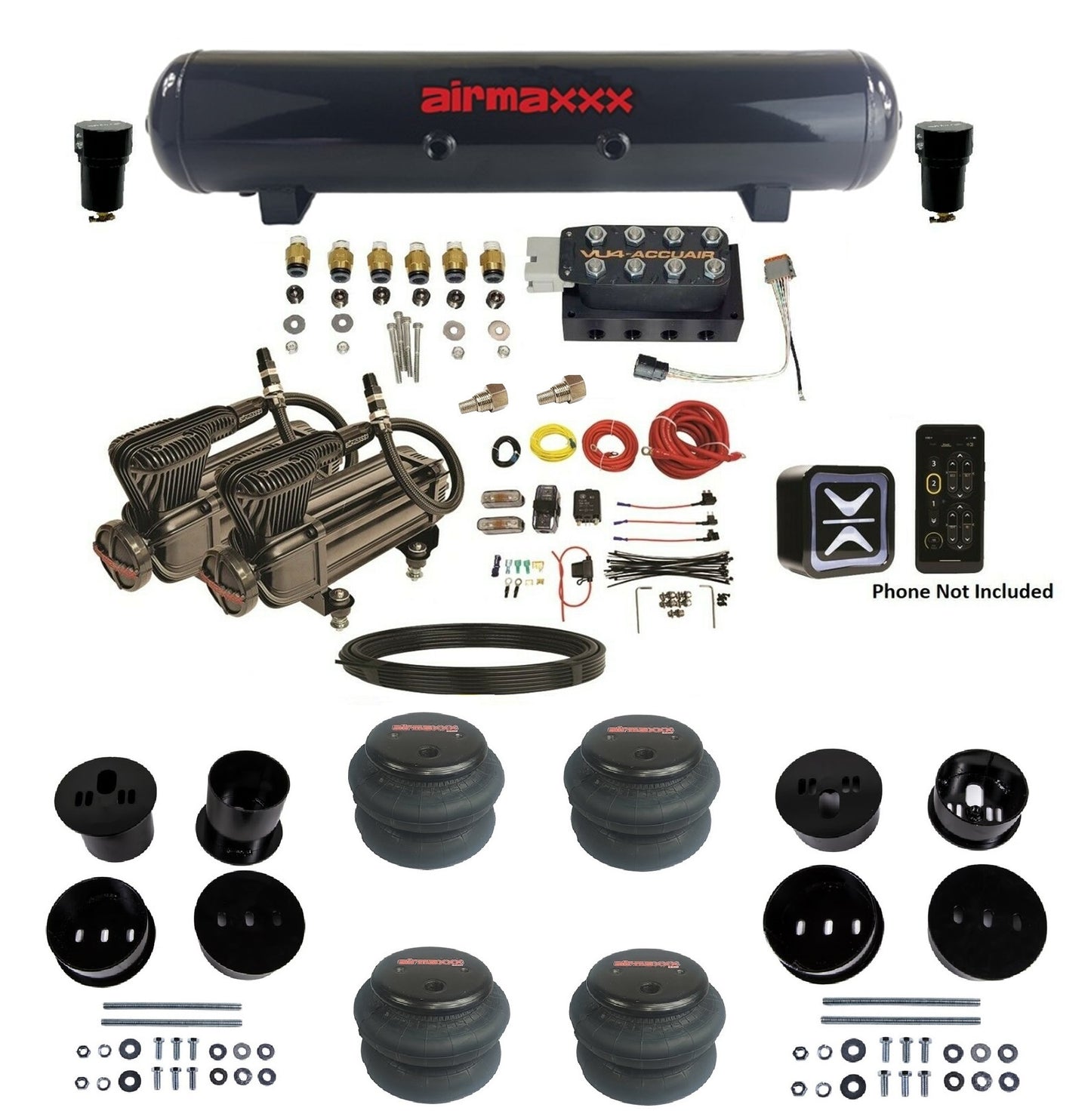 This premium setup features Bluetooth wireless control with 4-corner independent adjustability, giving you precision ride management right from your iOS or Android device. The AccuAir VU4 manifold simplifies installation with fewer fittings and cleaner lines — perfect for classic car enthusiasts seeking performance and simplicity.