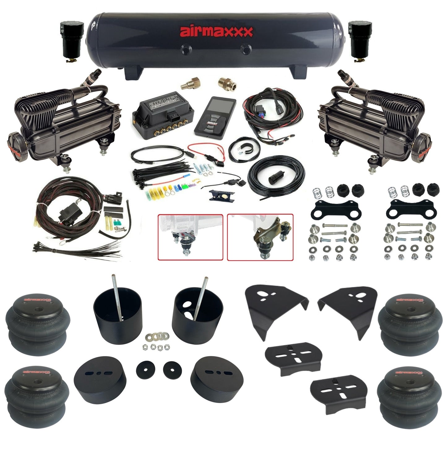 This all-inclusive setup includes everything needed for an easy installation—wiring, fittings, and hoses—along with dual airmaxxx Black 580 compressors and a black seamless 5-gallon air tank for a sleek, clean look. With five programmable pressure presets, Bluetooth control, and automatic rise on start, this kit delivers both function and reliability for your truck.